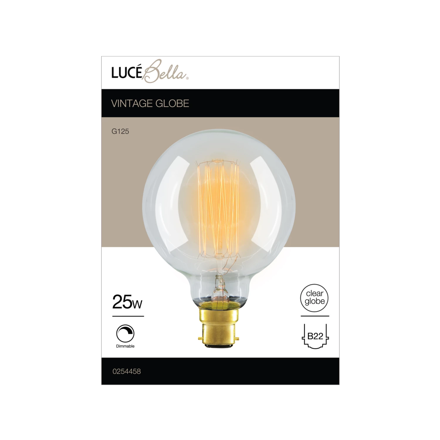 Light up your home with the Luce Bella G125 B22 Clear 25W Vintage Globe. This decorative globe has a vintage appearance that will bring warmth to any room of the home.This globe can be used to create a focal point and to enrich the design elements of your favourite fitting
