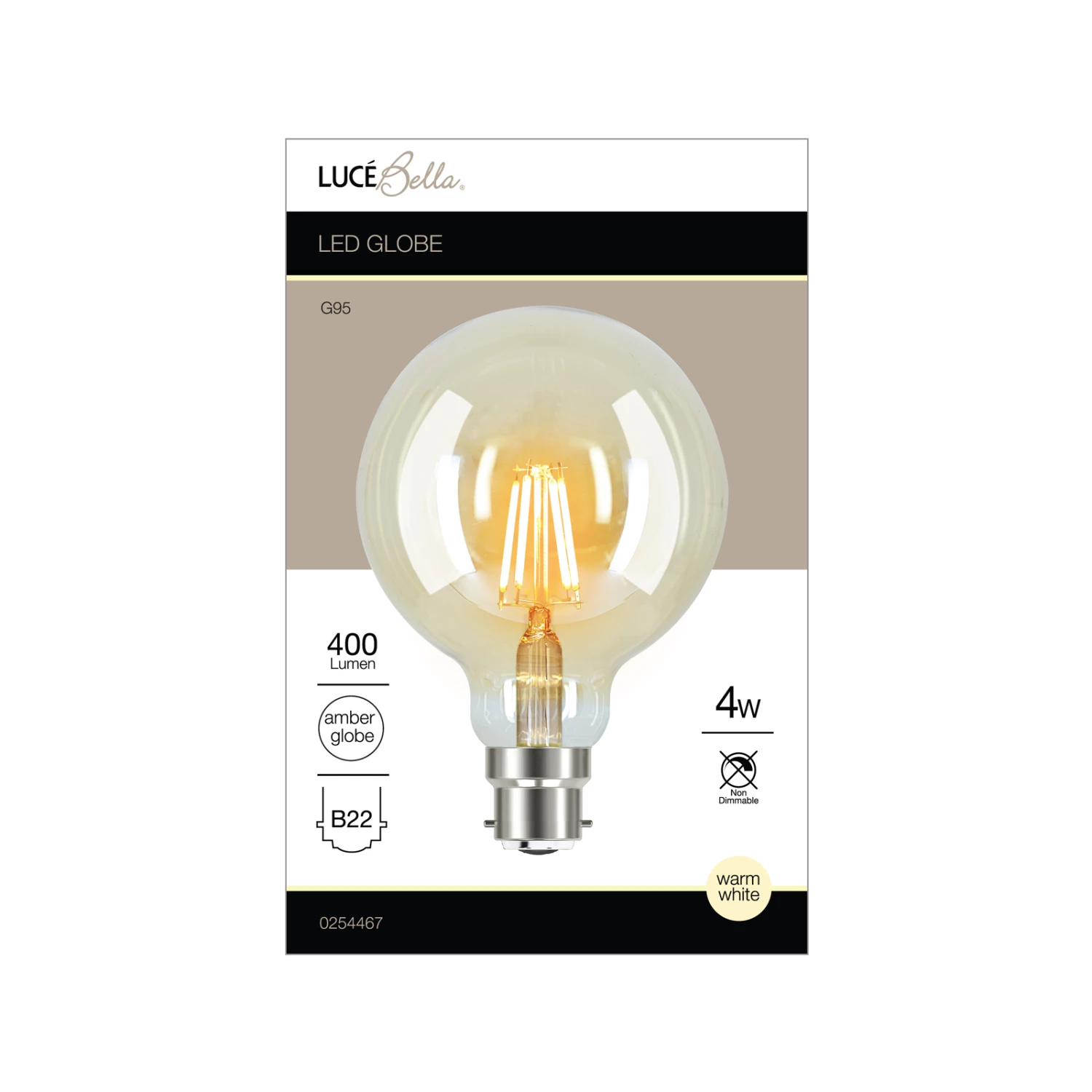 Light up your home with the Luce Bella G95 B22 LED 400 Lumen Amber Warm White 4W Globe. This decorative globe has an amber appearance that will bring warmth to any room of the home.This bulb has a colour temperature of 2700K, providing you with a warm, tranquil atmosphere, and the Amber coloured glass provides a very cozy light