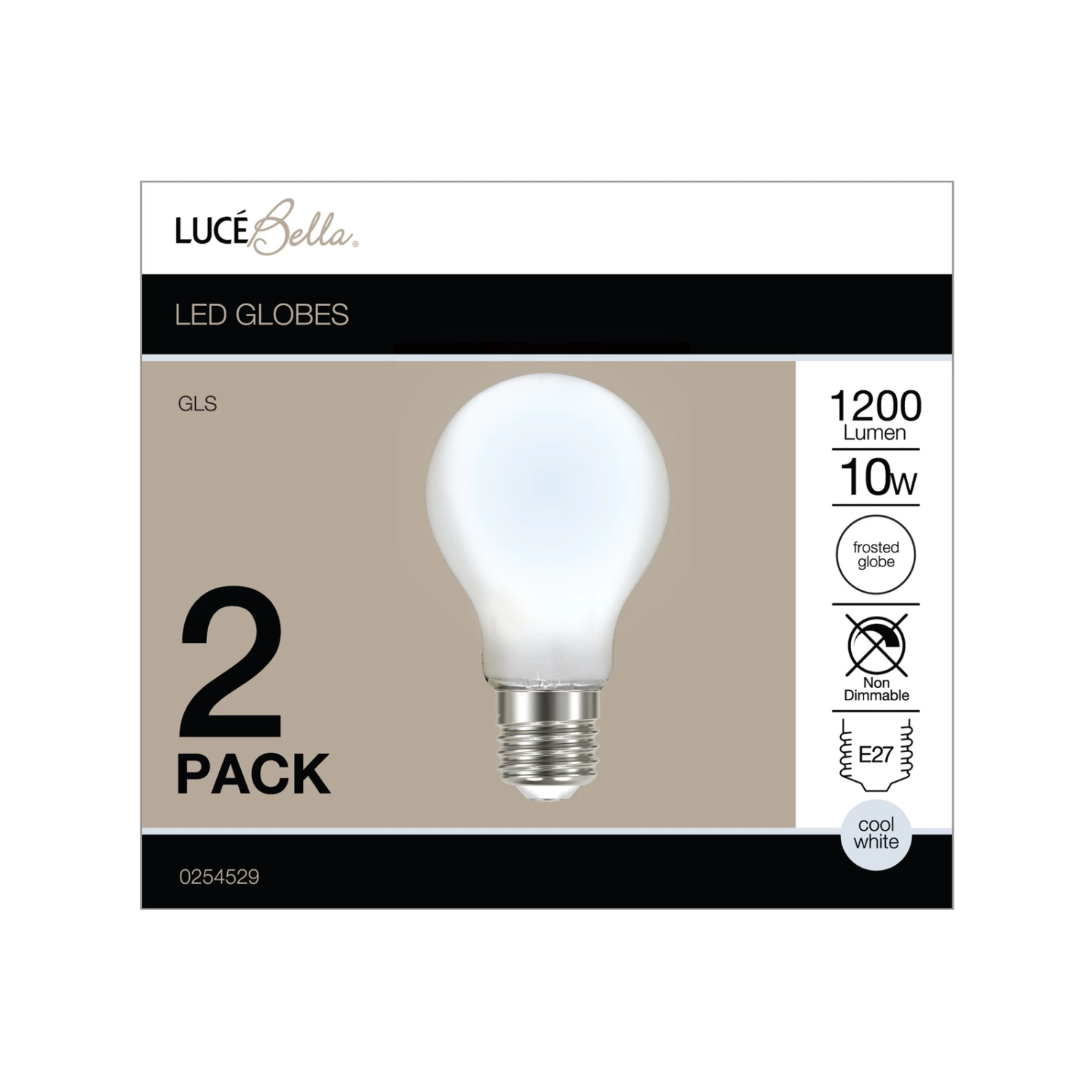 The Luce Bella GLS Filament E27 LED 1200 Lumen Cool White, Frosted 10W Globe, provides ambient lighting that will enhance the atmosphere of any area.This bulb has a colour temperature of 4000K, providing a bright white light, that’s ideal in kitchens, bathrooms, and workspaces2 Pack