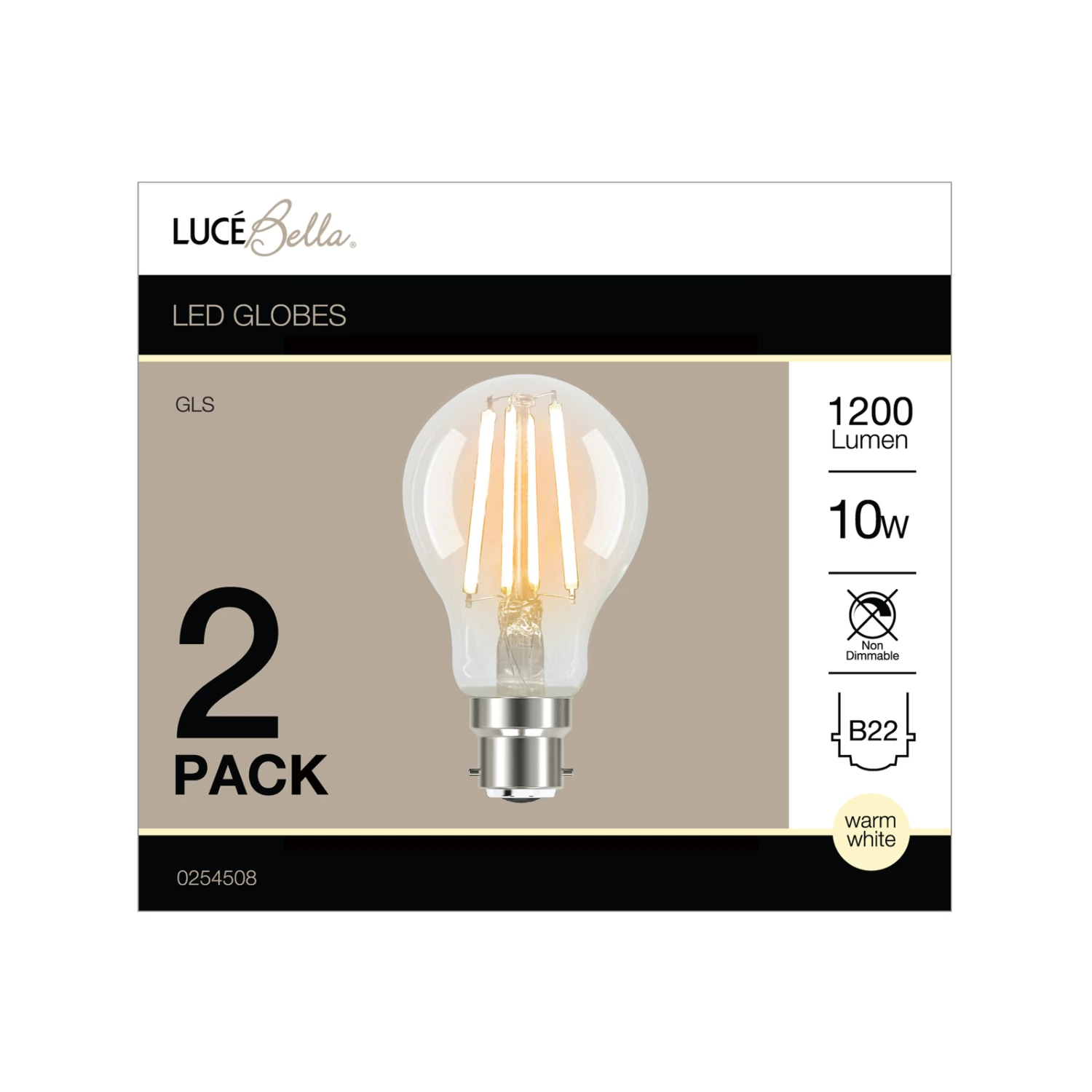 The Luce Bella GLS Filament B22 LED 1200 Lumen Warm White 10W Globe, provides ambient lighting that will enhance the atmosphere of any area.This bulb has a colour temperature of 3000K, providing you with a warm, tranquil atmosphere.2 Pack
