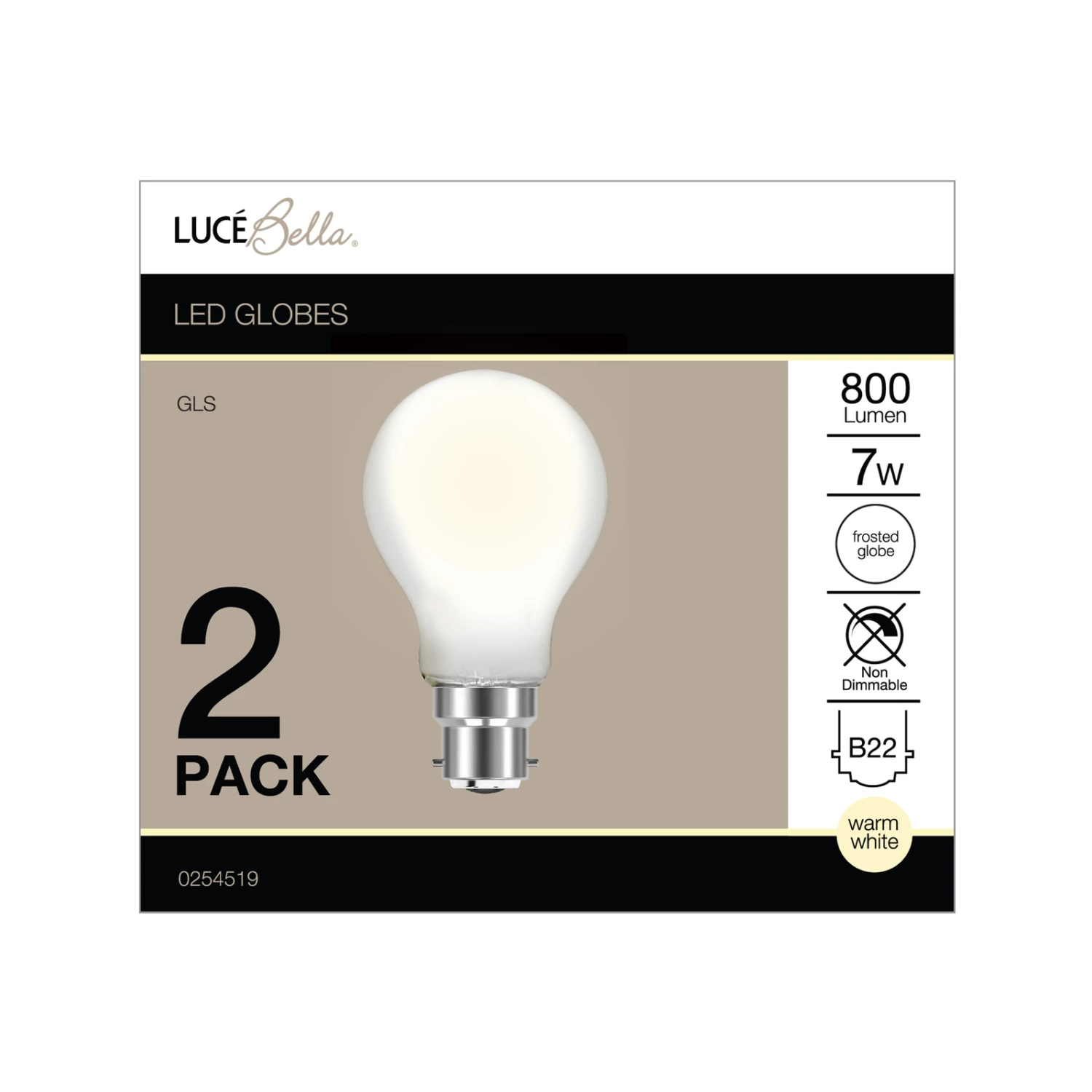The Luce Bella GLS Filament B22 LED 800 Lumen Warm White, Frosted 7W Globe, provides ambient lighting that will enhance the atmosphere of any area.This bulb has a colour temperature of 3000K, providing you with a warm, tranquil atmosphere.2 Pack