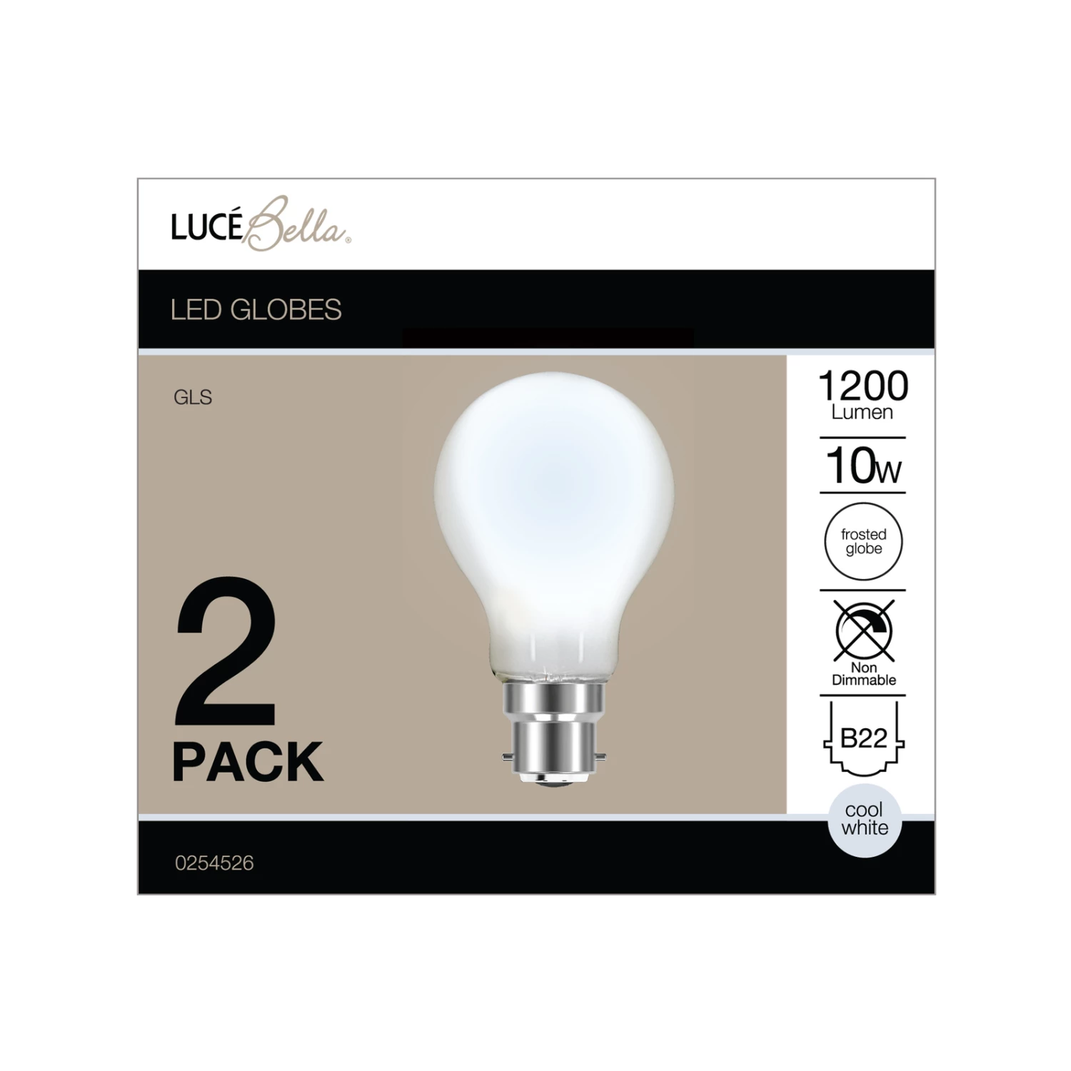 The Luce Bella GLS Filament BC LED 1200 Lumen Cool White, Frosted 10W globe, provides ambient lighting that will enhance the atmosphere of any area.This bulb has a colour temperature of 4000K, providing a bright white light, that’s ideal in kitchens, bathrooms, and workspaces2 Pack